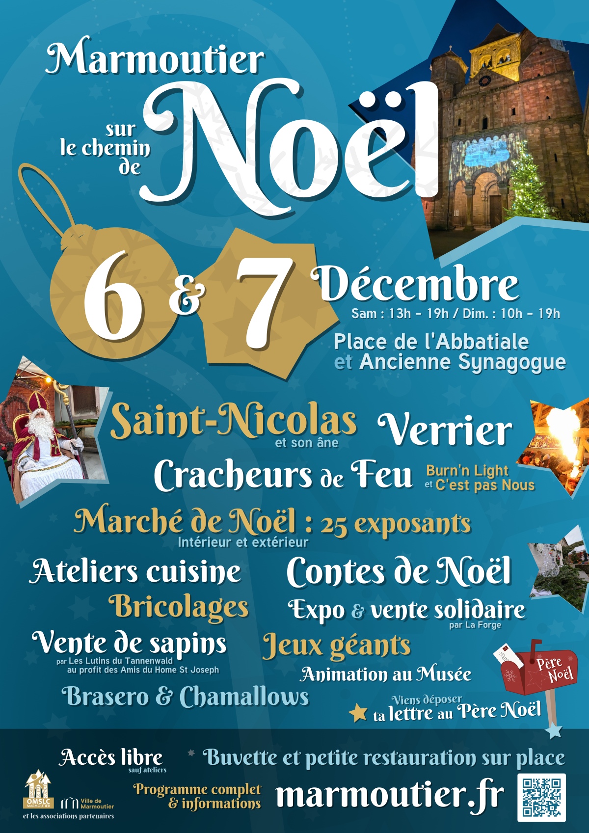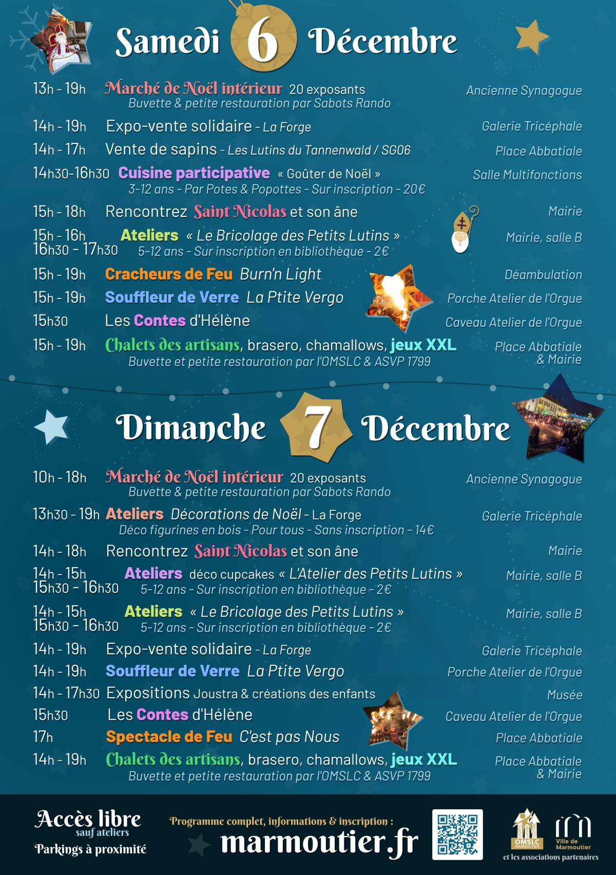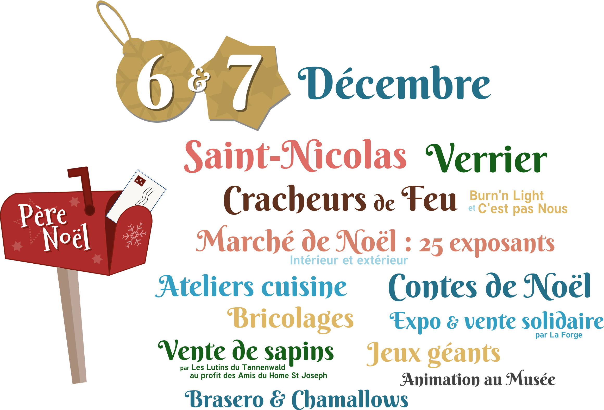 Au programme : rencontre avec le Saint Nicolas, cracheurs de feu en déambulation et spectacle de feu (par Burn'n'Light et C'est pas nous), marché de Noël intérieur (20 artisans et exposants dans la salle communale), démonstration par un souffleur de verre, les contes d'Hélène, atelier cuisine, bricolage de Noël, brasero & chamallows, chalets d'artisans sur la place, expo et vente solidaire par la Forge, jeux XXL en bois et vente de sapins (par les Lutins du Tannenwald sous l'égide de la SG.06, au profit des Amis du Home St Joseph).